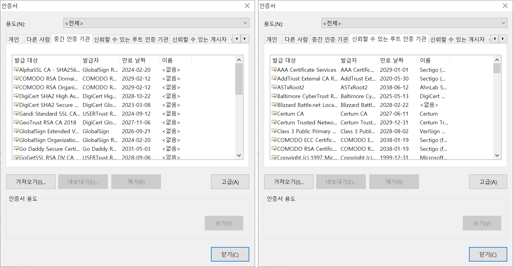 브라우저에 기 등록된 인증서를 파일로 따로 백업해두고 싶은 경우는 crt형식(위 pem파일 포맷의 인증서)으로 export하면 되며, 나중에 따로 해당 파일을 더블클릭하여 설치하면 간단하게 인증서 저장소에 다시 추가할 수 있으므로 PC 인증서 삭제를 너무 무서워하지 않아도 된다.